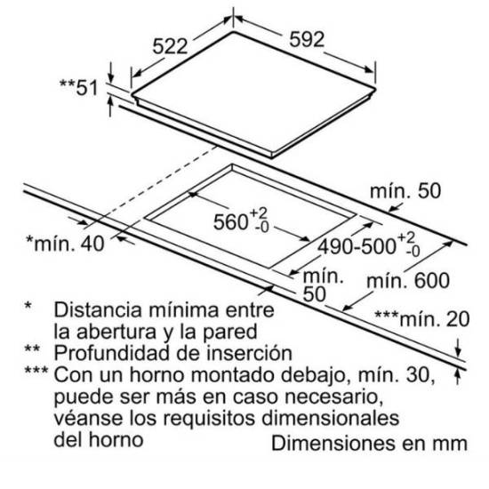 - Kích thước bếp 51 x 592 x 522 mm: khi khoét đá, nên khoét theo kích thước 51 x 560 x 490-500 mm, vì bếp lắp âm nên yêu cầu kích thước chuẩn xác.