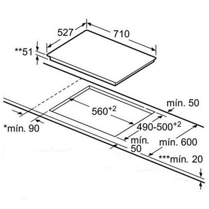 - Kích thước hộc bếp: 560 – 562R x 490 – 500S x 51C (mm)