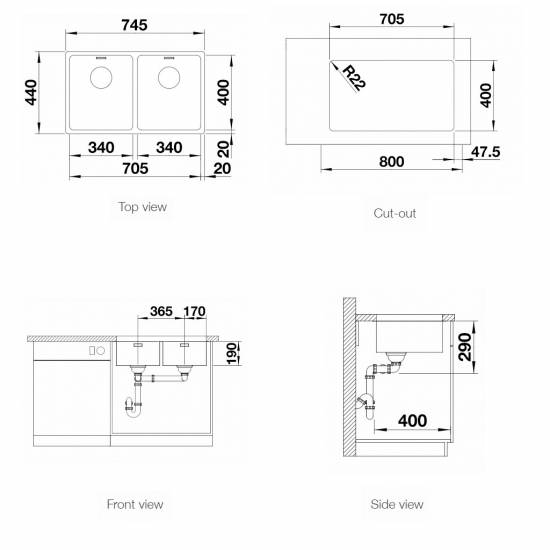 Kích thước của chậu rửa bát Blanco Andano 340/340-IF 522983
