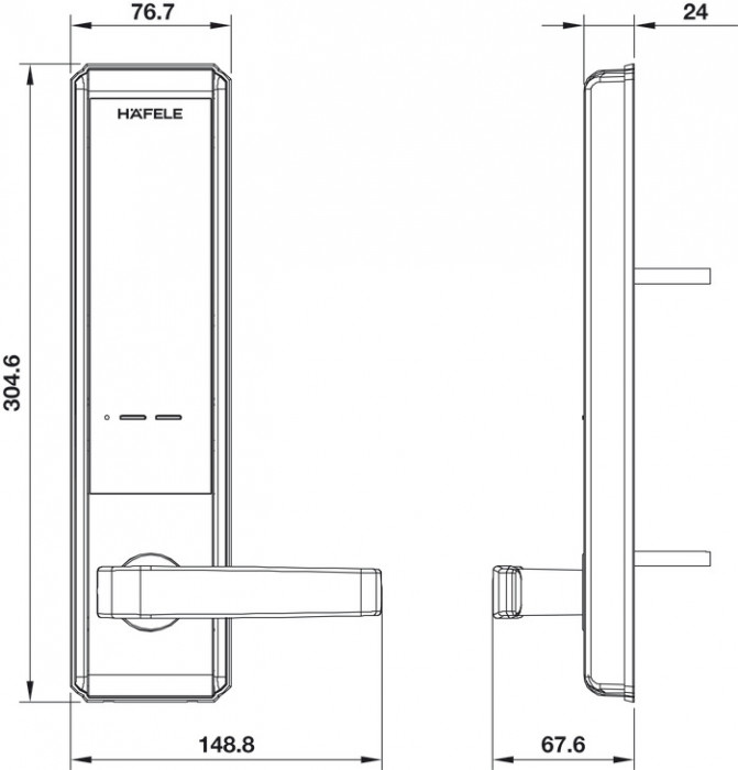 + Kích thước thân khóa ngoài: 76.7 x 304.6 x 24 mm