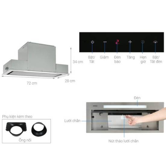 – Thiết kế dạng âm hoàn toàn lắp đáy tủ trên rộng 720mm