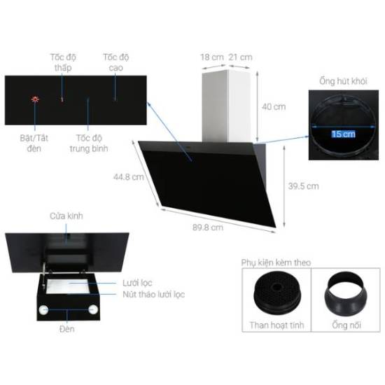 – Chức năng hút xả tuần hoàn bằng than hoạt tính hoặc thoát ống ra ngoài , đường kính ống thoát 150mm