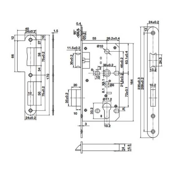 + Khoảng cách từ cạnh cửa đến tâm lỗ ruột khoá (a): 55 mm